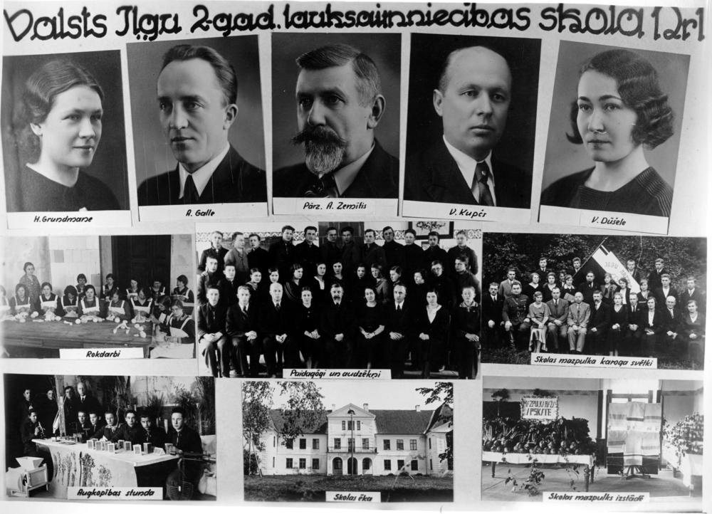 Valsts Iļģu divgadīgā lauksaimniecības skola. Augšējā 1. rindā no kreisās: 1. H. Grundmane, 2. A. Galle, 3. skolas pārzinis A. Zemītis, 4. skolotājs Valdis Kupčs, 5. V. Dūšele. 2. rindā no kreisās: 1. rokdarbu nodarbība, 2. pedagogu un audzēkņu kopbilde, 3. skolas mazpulka organizācijas karoga svētki. 3. rindā no kreisās: 1. augkopības stunda, 2. skolas ēka, 3 skolas mazpulku organizācijas dalībnieku darinājumi izstādē. Fotomontāža.