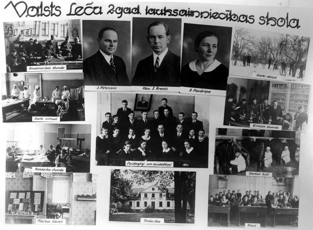 Valsts Leču divgadīgā lauksaimniecības skola. Augšējā 1. rindā no kreisās: 1. amatniecības stunda, 2. J. Pētersons, 3. skolas pārzinis Jēkabs Ārents, 4. A. Pavāriņa, 5. praktiskā nodarbība dārzā. 2. rindā no kreisās: 1. praktiskā nodarbība virtuvē, 2. ķīmijas stunda. 3. rindā no kreisās: 1. rokdarbu stunda, 2. pedagogu un audzēkņu kopbilde, 3. praktiskā nodarbība kūtī. 4. rindā no kreisās: 1. mācību līdzekļi, 2. skolas ēka, 3. audzēkņi mācību klasē. Fotomontāža.