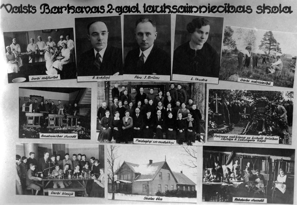 Valsts Barkavas divgadīgā lauksaimniecības skola. Augšējā 1. rindā no kreisās: 1. praktiskā nodarbība mājturībā, 2. A. Krēsliņš, 3. skolas pārzinis Jānis Brūns, 4. L. Skudra, 5. praktiskā nodarbība mērniecībā. 2. rindā no kreisās: 1. amatniecības stunda, 2. pedagogu un audzēkņu kopbilde, 3. vainaga nolikšana uz kritušā Latvijas brīvības cīņu dalībnieka A. Lakstīgals kapa. 3. rindā no kreisās: 1. ķīmijas mācību stunda, 2. skolas ēka, 3. rokdarbu mācību stunda. Fotomontāža.