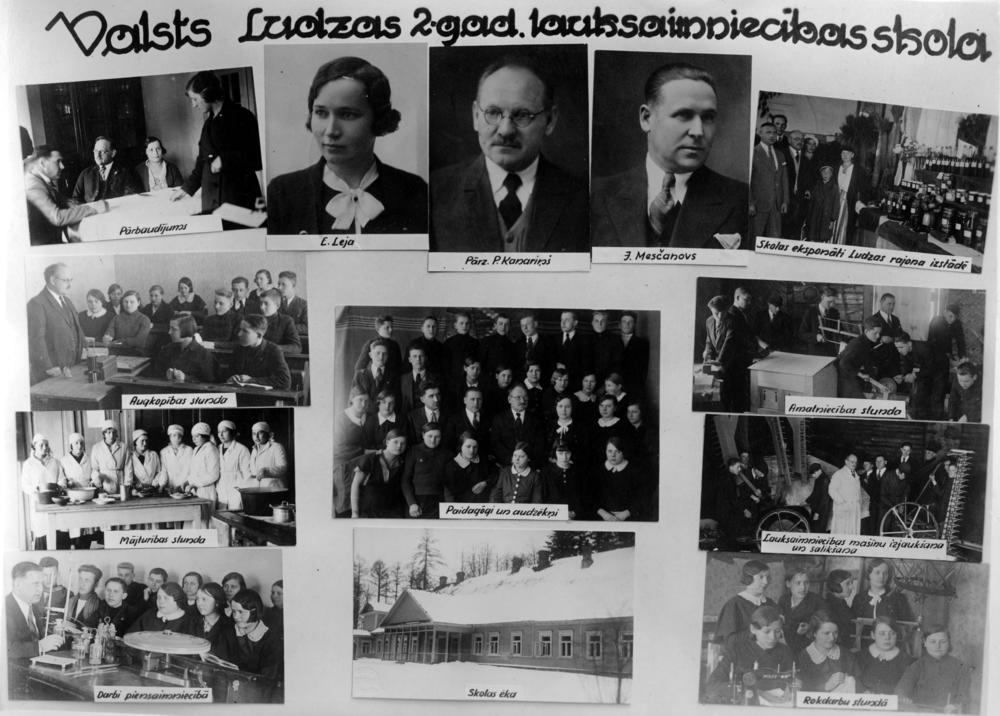 Valsts Ludzas divgadīgā lauksaimniecības skola. Augšējā 1. rindā no kreisās: 1. audzēkņi pārbaudes darba laikā, 2. E. Leja, 3. skolas pārzinis Paulis Kanaviņš, 4. J. Mesčanovs, 5. skolas sagatavotie eksponāti Ludzas rajona izstādē. 2. rindā no kreisās: 1. augkopības mācību stunda, 2. amatniecības mācību stunda. 3. rindā no kreisās: 1. mājturības mācību stunda, 2. pedagogu un audzēkņu kopbilde, 3. lauksaimniecība mašīnu izjaukšana un salikšana. 4. rindā no kreisās: 1. praktiskās nodarbības piensaimniecībā, 2. skolas ēka, 3. rokdarbu mācību stunda. Fotomontāža.