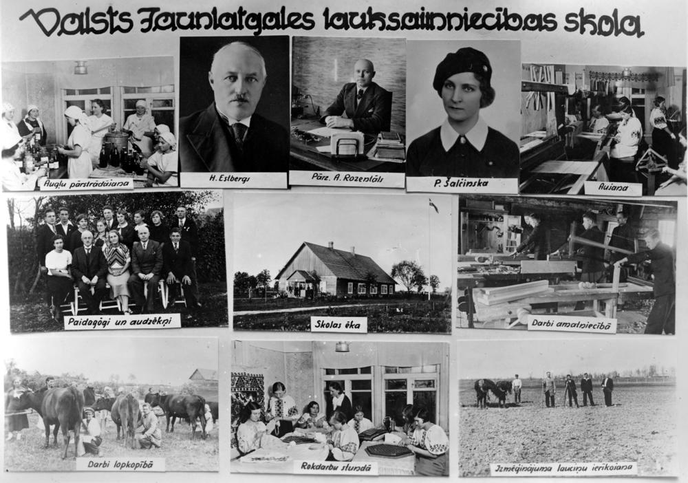 Valsts Jaunlatgales lauksaimniecības skolas darbinieki un mācību nodarbības. Augšējā 1. rindā no kreisās: 1. augļu pārstrādāšanas skats skolas virtuvē, 2. H. Estberga portrets, 3. skolas pārziņa Artura Rozentāla portrets, 4. P. Šalčinskas portrets, 5. aušanas stundas skats. 2. rindā no kreisās: 1. pedagogu un audzēkņu grupas foto, 2. skolas ēkas skats, 3. amatniecības nodarbības skats darbnīcā. 3. rindā no kreisās: 1. lopkopības nodarbība pie fermas, 2. rokdarbu stunda klasē, 3. izmēģinājumu lauciņu ierīkošana. Fotomontāža.