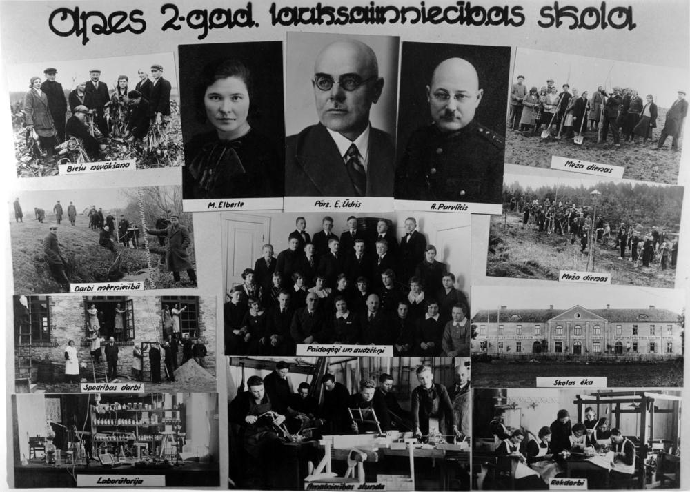Apes divgadīgā lauksaimniecības skola (no 1944. līdz 1994. gadam Apes Lauksaimniecības skola). Augšējā 1. rindā no kreisās: 1. audzēkņi biešu novākšanā, 2. M. Elberte, 3. skolas pārzinis Ernests Ūdris, 4. A. Purvlīcis, 5. audzēkņi meža dienās. 2. rindā no kreisās: 1. darbi mērniecībā, 2. audzēkņi meža dienās. 3. rindā no kreisās: 1. audzēkņi spodrības darbos, 2. pedagogu un audzēkņu kopbilde, 3. skolas ēka. 4. rindā no kreisās: 1. laboratorija, 2. audzēkņi amatniecības stundā, 3. audzēknes rokdarbu nodarbībā. Fotomontāža.