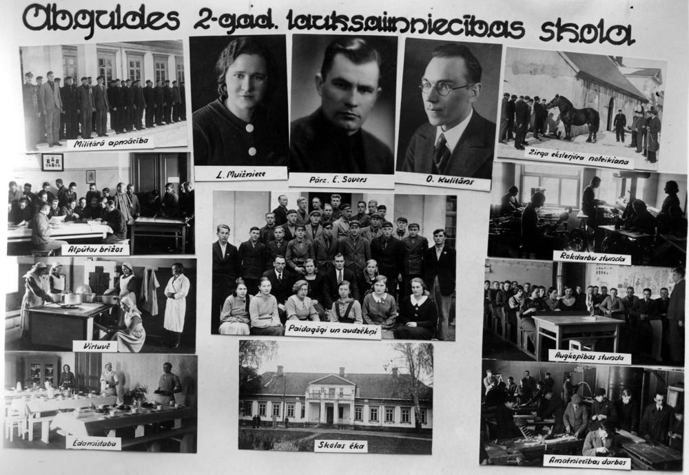 Apguldes divgadīgā lauksaimniecības skola. Augšējā 1. rindā no kreisās: 1. audzēkņi militāro apmācību laikā, 2. L. Muižniece, 3. skolas pārzinis Ernests Sovers, 4. O. Kulitāns, 5. zirga apskate. 2. rindā no kreisās: 1. audzēkņi atpūtas brīdī, 2. rokdarbu mācību stunda. 3. rindā no kreisās: 1. audzēkņi virtuvē, 2. pedagogu un audzēkņu kopbilde, 3. augkopības mācību stunda. 4. rindā no kreisās: 1. ēdamistaba, 2. skolas ēka, 3. praktiskā nodarbība amatniecībā. Fotomontāža.