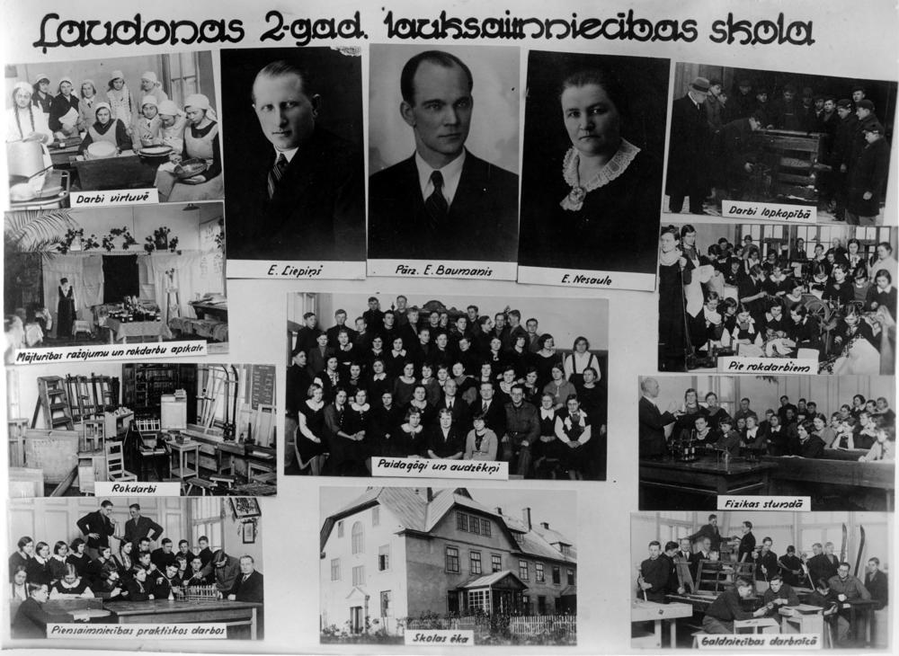 Ļaudonas divgadīgā lauksaimniecības skola. Augšējā 1. rindā no kreisās: 1. audzēknes virtuvē, 2. E. Liepiņš, 3. skolas pārzinis Eduards Baumanis, 4. E. Nesaule, 5. praktiskā nodarbība lopkopībā. 2. rindā no kreisās: 1. mājturības ražojumu un rokdarbu izstāde, 2. audzēkņi brokastu laikā. 3. rindā no kreisās: 1. audzēkņu darinātie rokdarbi, 2. pedagogu un audzēkņu kopbilde, 3. fizikas mācību stunda. 4. rindā no kreisās: 1. praktiskā nodarbība piensaimniecībā, 2. skolas ēka, 3. nodarbība galdniecības darbnīcā. Fotomontāža.