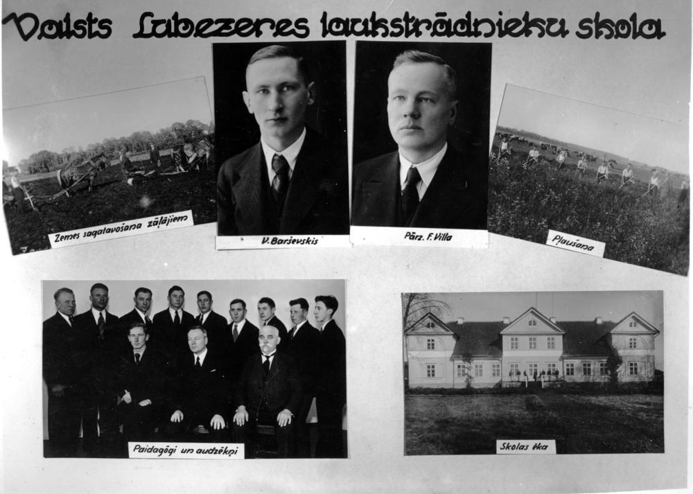 Valsts Lubezeres laukstrādnieku skola. Augšējā 1. rindā no kreisās: 1. zemes sagatavošana zālājiem, 2. V. Barševskis, 3. skolas pārzinis Fricis Villa, 4. zāles pļaušana. 2. rindā no kreisās: 1. pedagogu un audzēkņu kopbilde, 2. skolas ēka. Fotomontāža.