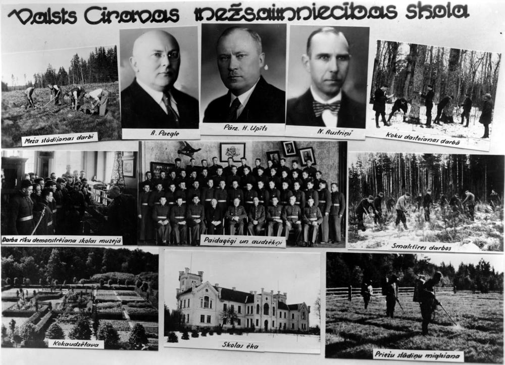 Valsts Cīravas mežsaimniecības skola. Augšējā 1. rindā no kreisās: 1. audzēkņi meža stādīšanas darbos, 2. mežzinis un Mērniecības skolotājs A. Paegle, 3. Mežu departamenta direktors un bijušais skolas priekšnieks (1922-1928) Hugo Upītis (arī Hūgo Upīts), 4. Aizputes virsmežzinis un skolotājs Nikolajs Austriņš, 5. audzēkņi veicot koku dastošanu. 2. rindā no kreisās: 1. darba rīku demonstrēšana skolas muzejā, 2. pedagogi un audzēkņi, 3. audzēkņi smalctīres darbos. 3. rindā no kreisās: 1. kokaudzētava, 2. skolas ēka (Cīravas muižas pils) ziemā, 3. audzēkņi miglo priežu stādiņus. Fotomontāža.