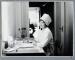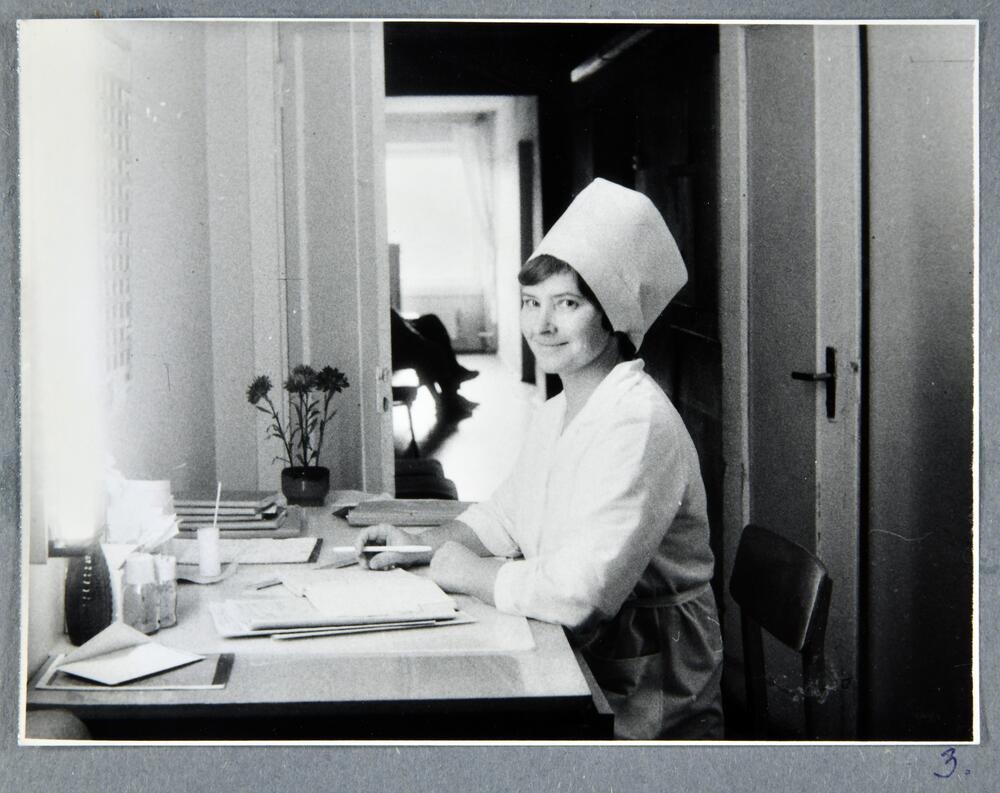 Rīgas pilsētas 6. apvienotās slimnīcas medmāsa pie darba galda veic pierakstus. Slimnīca atradās Dzirciema ielā 24. Portrets.