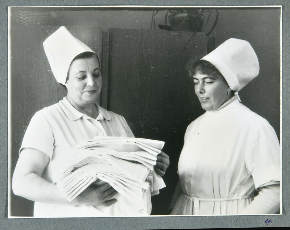 Rīgas pilsētas 6. apvienotās slimnīcas medmāsas ar medicīnas formu rokās. Slimnīca atradās Dzirciema ielā 24. Grupas foto.