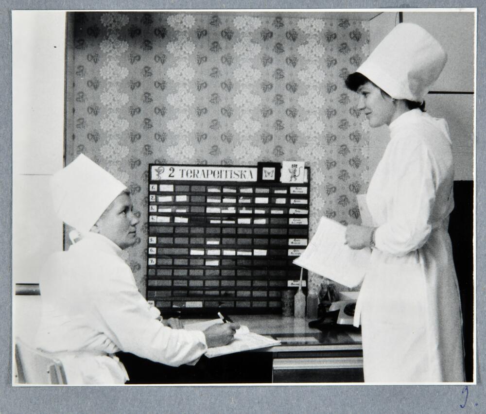 Rīgas pilsētas 6. apvienotās slimnīcas dežūrējošās medmāsas 2. terapeitiskā nodaļā. Viena no medmāsām pie galda veic pierakstus un sarunājas ar otro medmāsu. Slimnīca atradās Dzirciema ielā 24.