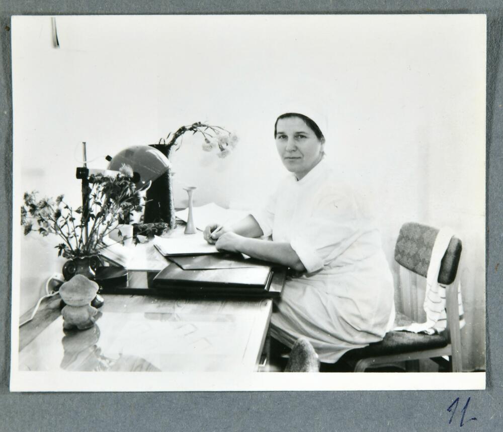 Rīgas pilsētas 6.apvienotās slimnīcas (Dzirciema ielā 24) ārste savā kabinetā pie darba galda veic pierakstus.