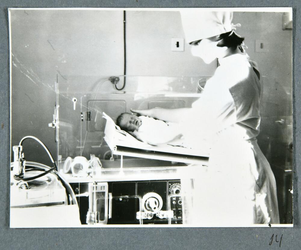 Rīgas pilsētas 6. apvienotās slimnīcas medicīnas darbiniece Dzemdību nodaļā aprūpe zīdaini inkubatorā. Slimnīca atradās Dzirciema ielā 24.