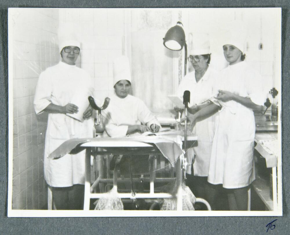 Rīgas pilsētas 6. apvienotās slimnīcas medicīnas darbinieces ginekologa kabinetā. Medmāsai labajā pusē rokās ir ķirurģiskās šķēres, speciāliste centrā, pie darba galda, veic pierakstus. Priekšplānā ir uzstādīts speciālais ginekologa kabineta ierīkojums pacientu apskatei. Slimnīca atradās Dzirciema ielā 24