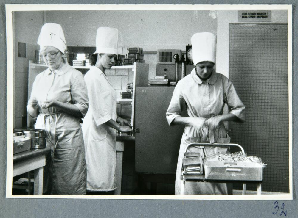 Rīgas pilsētas 6. apvienotās slimnīcas medmāsas laboratorijā sakārto medicīnas instrumentus. Medmāsas kārto instrumentus. redzams laboratorijas ledusskapis. Slimnīca atradās Dzirciema ielā 24.
