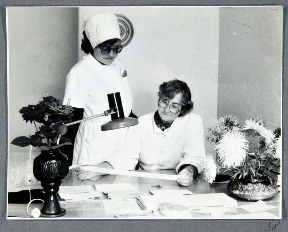 Rīgas pilsētas 6. apvienotās slimnīcas darbinieces aplūko sirds elektrokardiogrammas rezultātus.