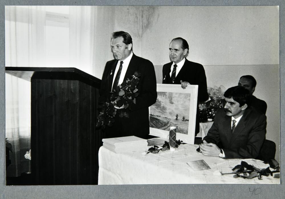 Rīgas pilsētas 6. apvienotās slimnīcas 25 gadu jubilejai veltītais svinīgais pasākums. Pie tribīnes stāv divi cilvēki ar gleznu un ziediem rokās. Slimnīca atradās Dzirciema ielā 24.