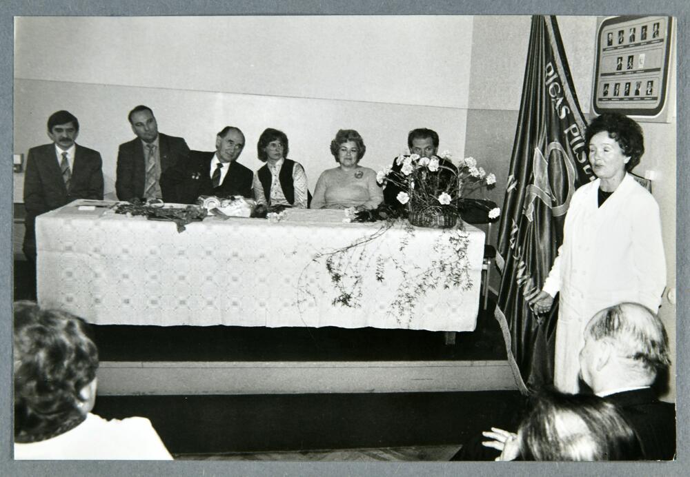 Rīgas pilsētas 6. apvienotās slimnīcas 25. gadu jubilejai veltītais svinīgais pasākums. Slimnīca atradās Dzirciema ielā 24. Slimnīcas ārste uzstājas auditorijas priekšā.