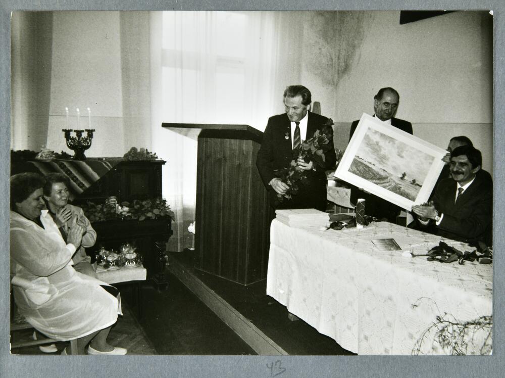 Rīgas pilsētas 6. apvienotās slimnīcas 25 gadu jubilejai veltītais svinīgais pasākums. Slimnīca atradās Dzirciema ielā 24. Darbinieku apbalvošana.