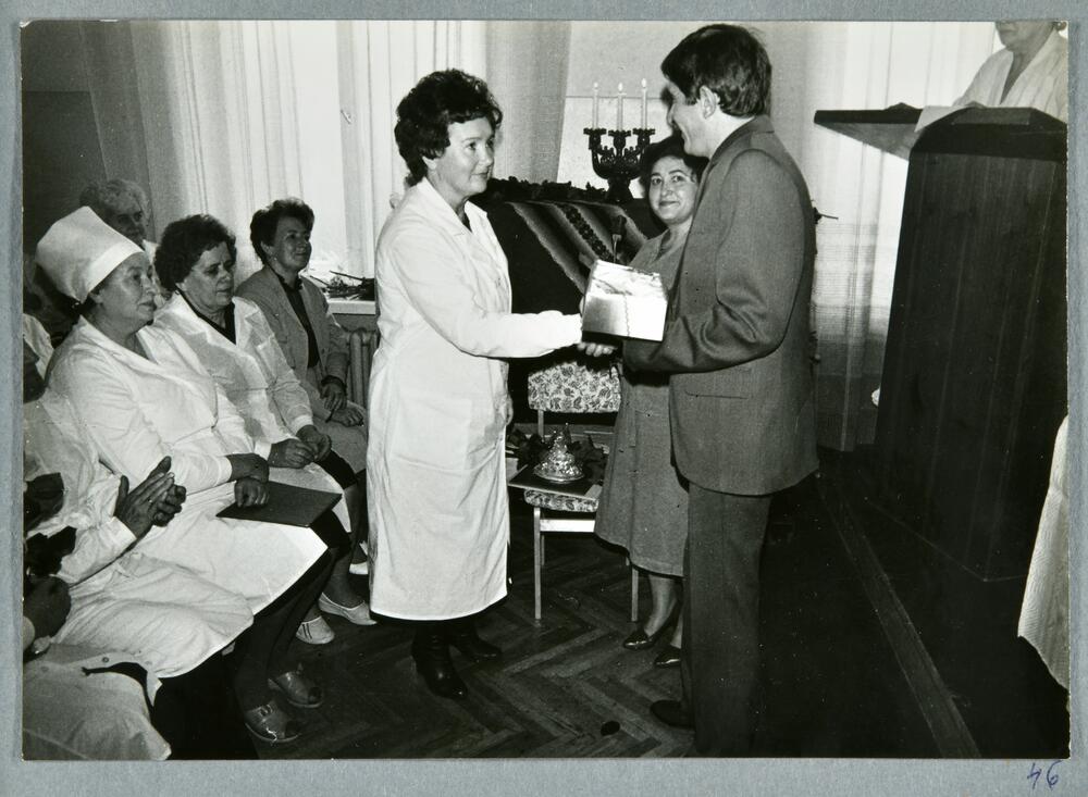 Rīgas pilsētas 6. apvienotās slimnīcas 25 gadu jubilejai veltītais svinīgais pasākums. Balvas pasniegšana slimnīcas darbiniecei.