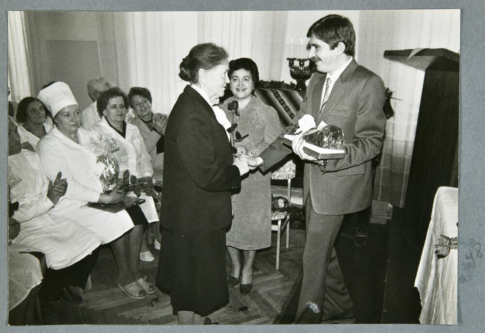 Rīgas pilsētas 6. apvienotās slimnīcas 25 gadu jubilejai veltītais svinīgais pasākums. Slimnīcas darbinieces apsveikšana.