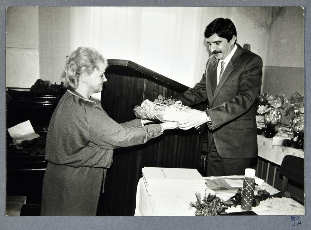 Rīgas pilsētas 6. apvienotās slimnīcas 25 gadu jubilejai veltītais svinīgais pasākums. Vīrietis pasniedz dāvanu medicīnas darbiniecei.