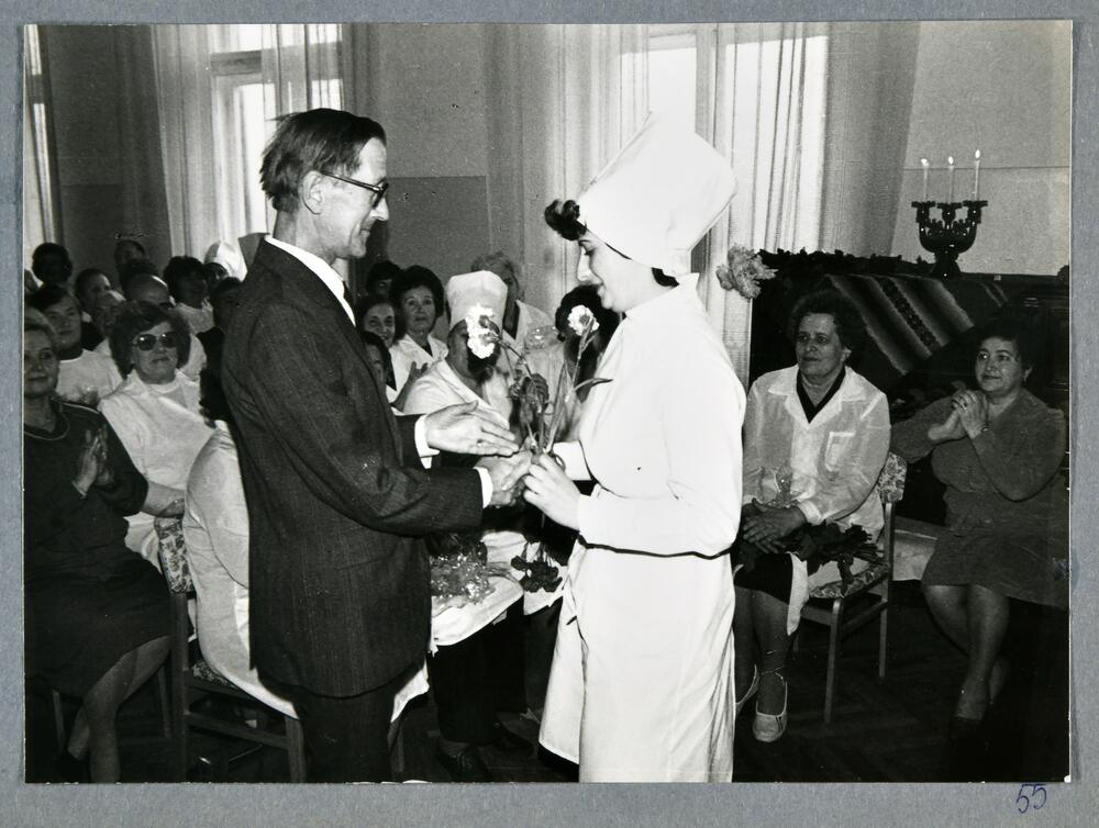 Rīgas pilsētas 6. apvienotās slimnīcas 25 gadu jubilejai veltītais svinīgais pasākums. Medmāsai tiek pasniegti ziedi.