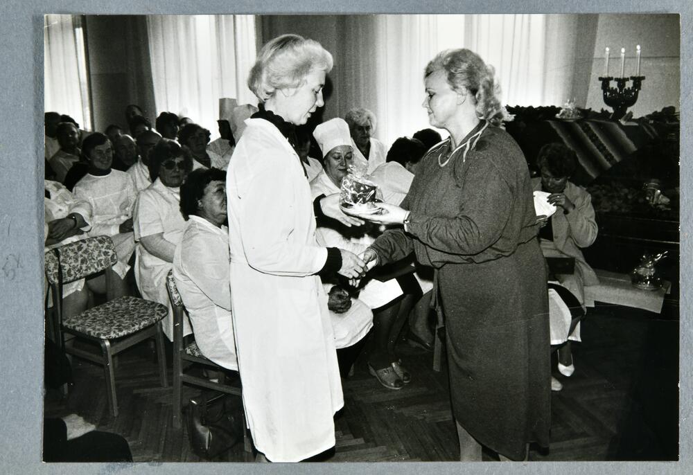 Rīgas pilsētas 6. apvienotās slimnīcas 25 gadu jubilejai veltītais svinīgais pasākums. Slimnīcas darbinieces sveikšana.
