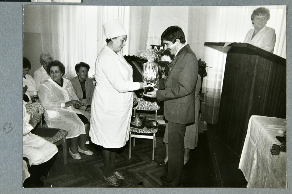 Rīgas pilsētas 6. apvienotās slimnīcas 25 gadu jubilejai veltītais svinīgais pasākums. Vīrietis pasniedz iesaiņotu lampu kā dāvanu slimnīcas darbiniecei.