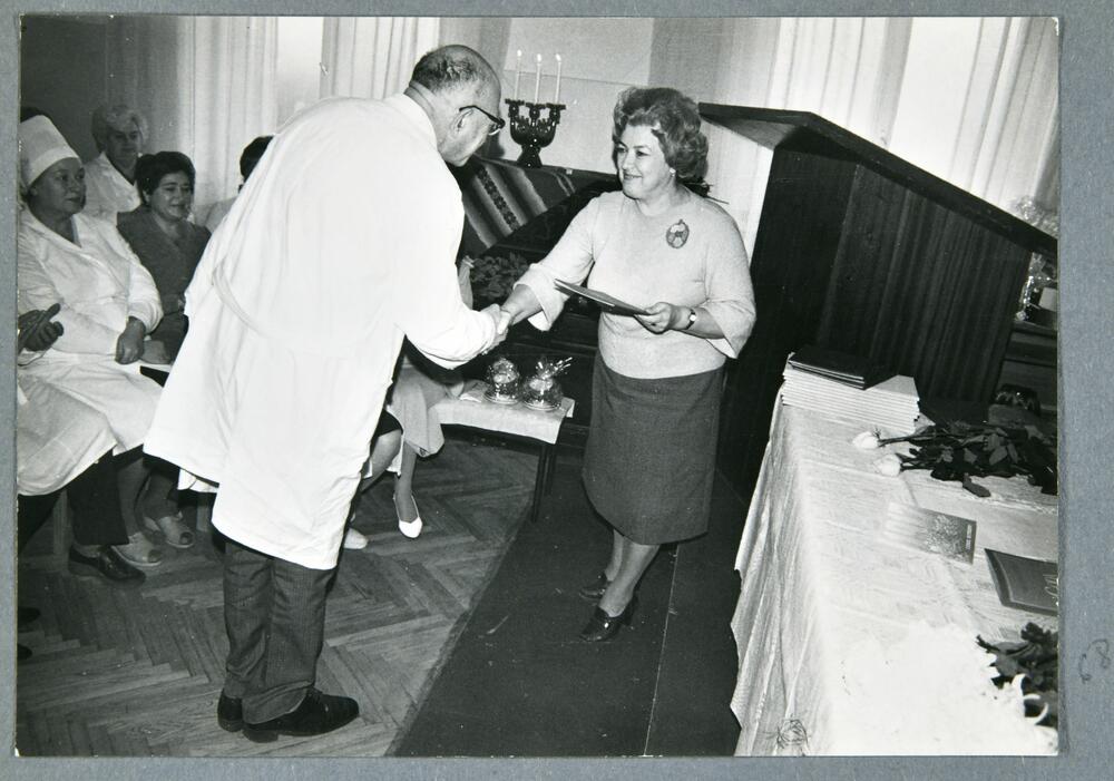 Rīgas pilsētas 6. apvienotās slimnīcas 25 gadu jubilejai veltītais svinīgais pasākums. Sieviete pasniedz Goda rakstu slimnīcas ārstam.