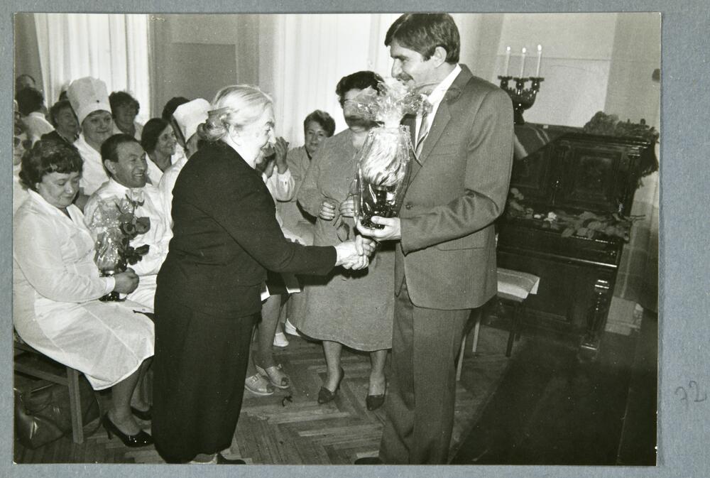 Rīgas pilsētas 6. apvienotās slimnīcas 25 gadu jubilejai veltītais svinīgais pasākums. Slimnīcas darbiniecei tiek pasniegta dāvana.