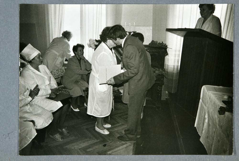 Rīgas pilsētas 6. apvienotās slimnīcas 25 gadu jubilejai veltītais svinīgais pasākums. Slimnīcas darbiniecei tiek pasniegts Atzinības raksts.