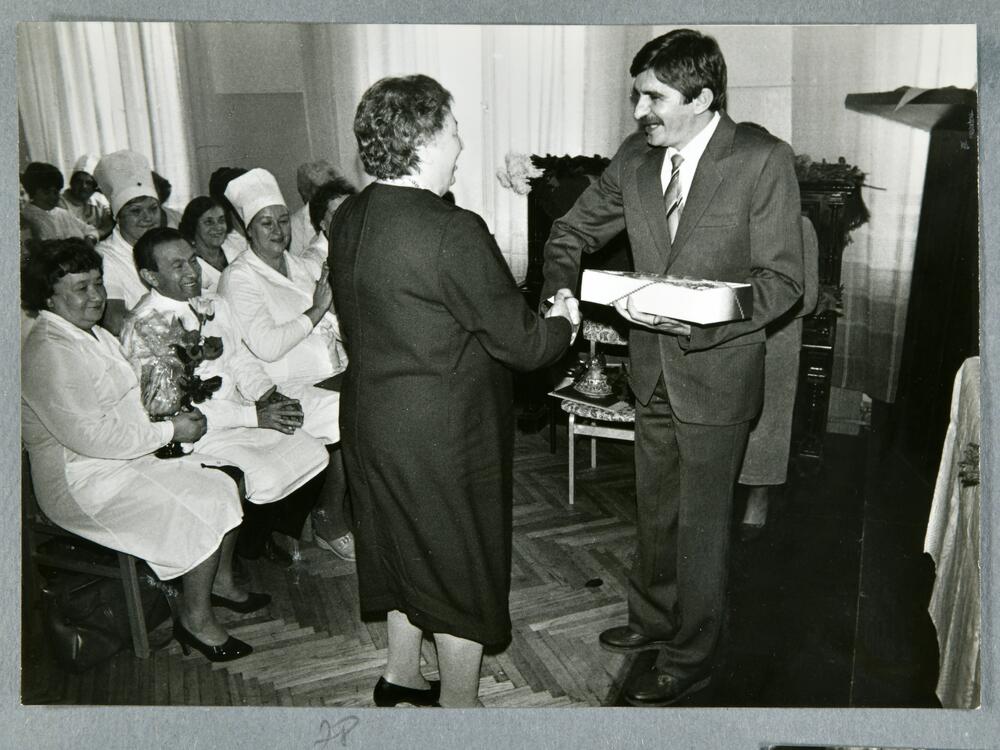 Rīgas pilsētas 6. apvienotās slimnīcas 25 gadu jubilejai veltītais svinīgais pasākums. Vīrietis ar dāvanu kasti rokās apbalvo slimnīcas darbinieci.