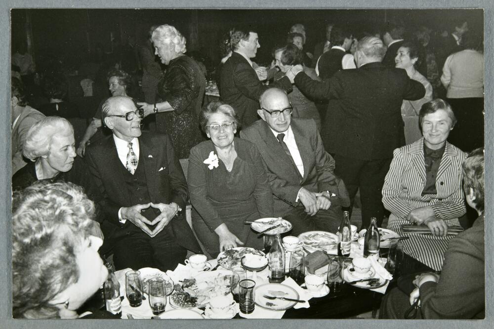 Rīgas pilsētas 6. apvienotās slimnīcas 25 gadu jubilejai veltītais svinīgais pasākums. Pasākuma dalībnieki pie klātiem galdiem.