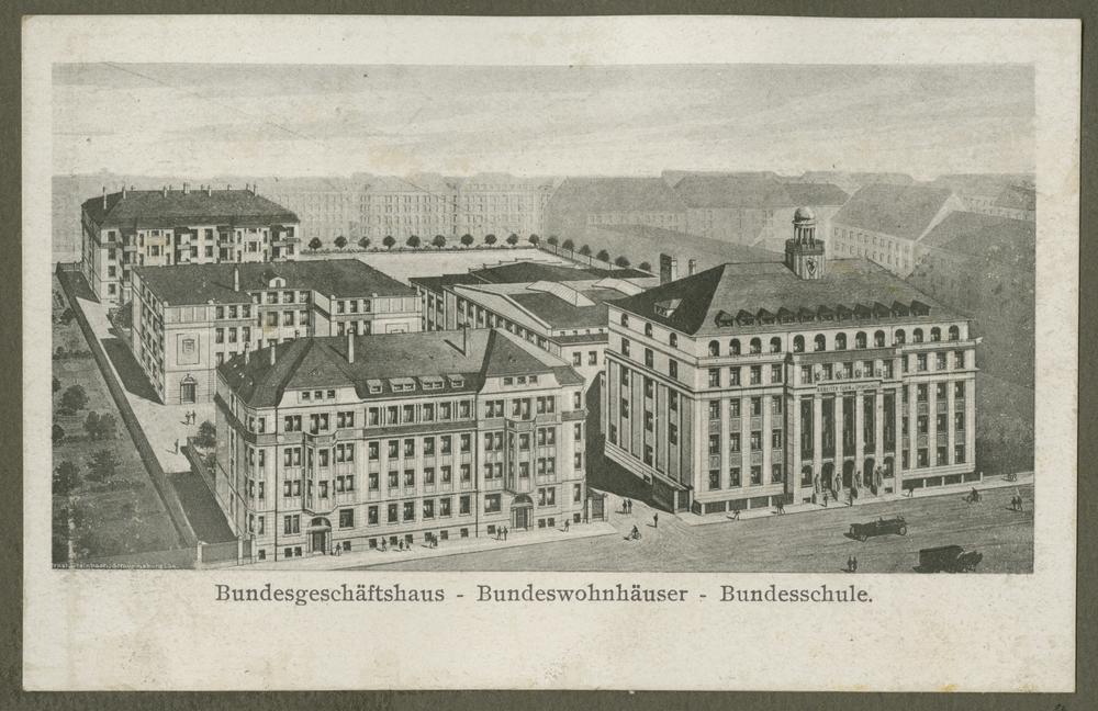 Vācijas strādnieku sporta un vingrošanas savienības sporta skola Leipcigā. Pastkarte ar uzrakstiem vācu valodā.