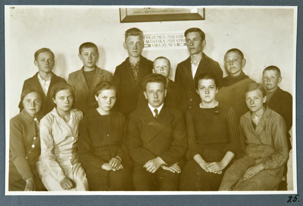 Dunikas pagasta Sikšņu 6-klašu pamatskolas skolēni ar skolas direktoru O. Jansonu (centrā). Grupas foto.