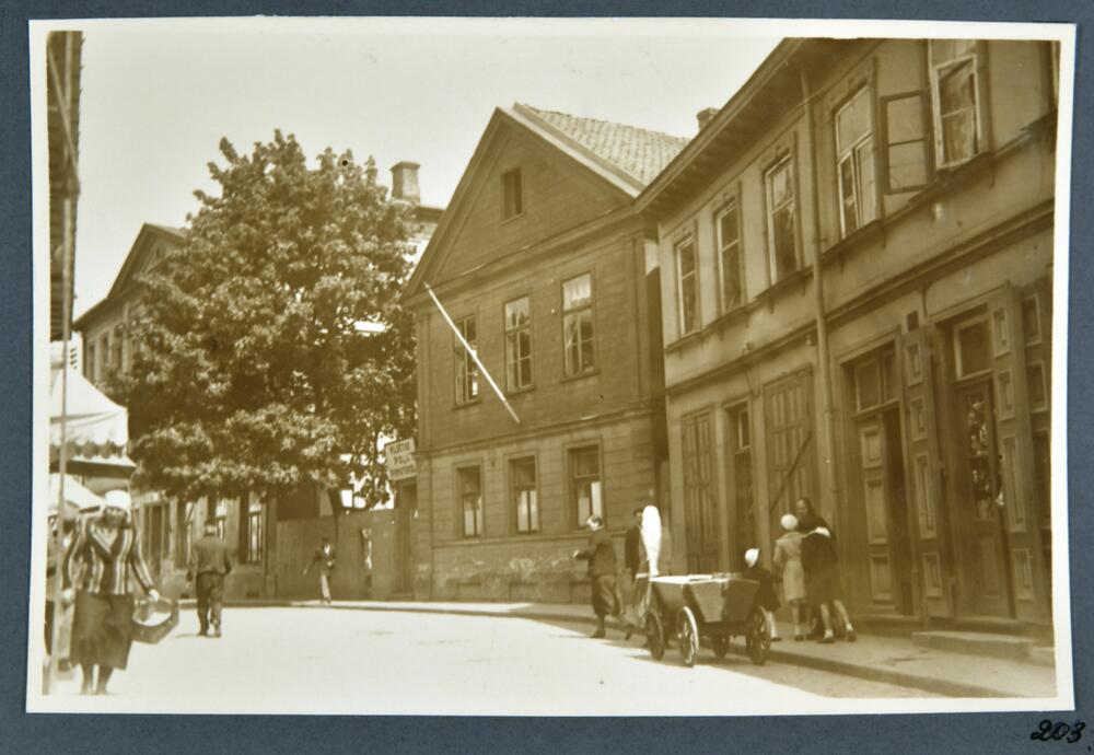 Liepājas pilsētas poļu pamatskolas ēka, Zivju ielā 9 (tagad veikalu ēka). Priekšplānā gājēji.