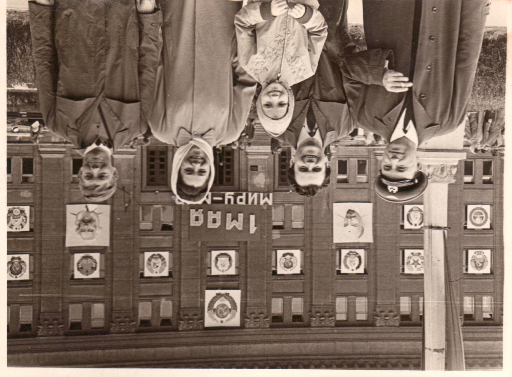 Cilvēki pulcējušies augstskolas (tagad Daugavpils Universitāte) laukumā. Ēkas logos iekarināti padomju republiku ģerboņi, Ļeņina un Marksa portreti, teksts krievu valodā “1. maijs. Miers pasaulei”.