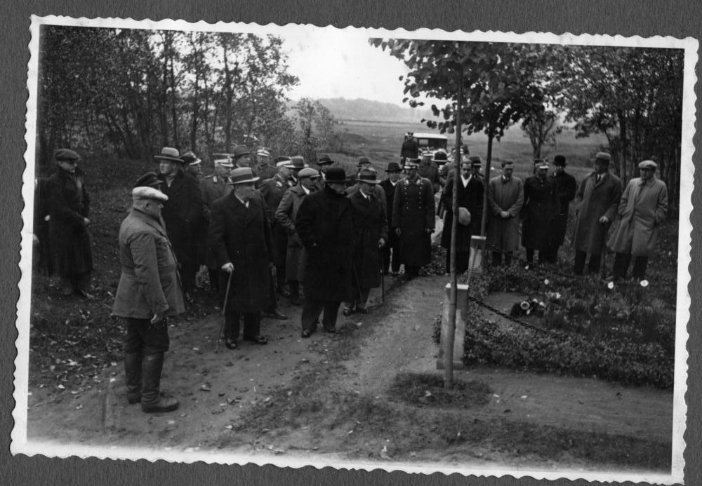 Latvijas Ministru prezidents Kālis Ulmanis (no kreisās), Valsts prezidents Alberts Kviesis (centrā) un valsts amatpersonas Nāves salas ģipšakmens lauztuvju apmeklējuma laikā.