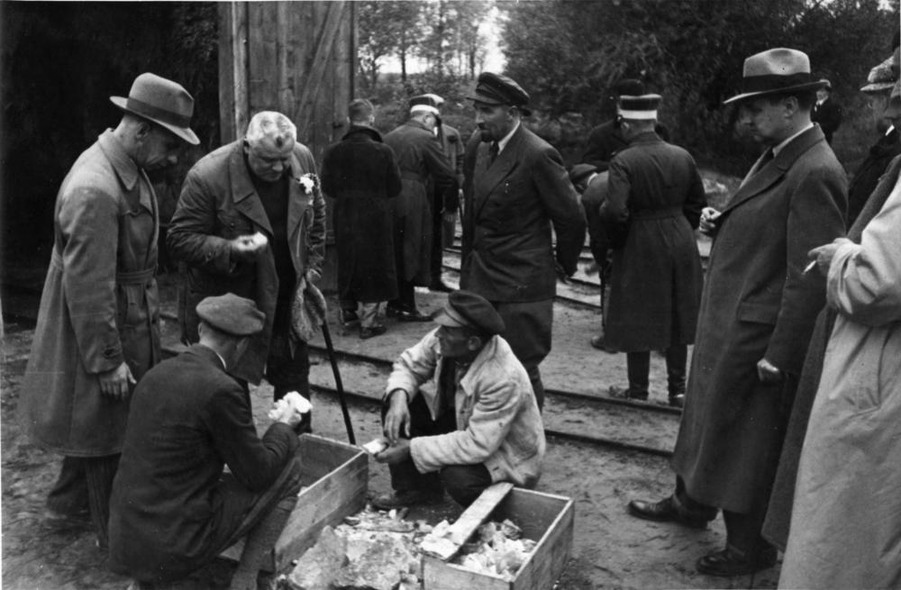 Latvijas Valsts amatpersonas iepazīstas ar darbu ģipša ieguves karjerā Nāves salā. No kreisās: 2. Latvijas Ministru prezidents Kārlis Ulmanis.