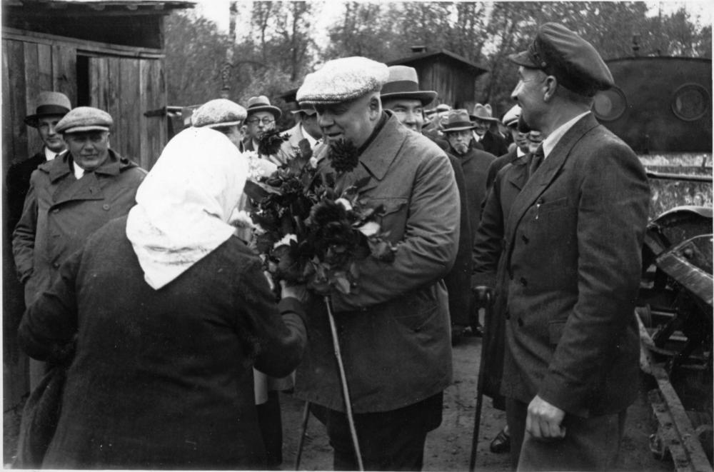 Latvijas Valsts amatpersonas Nāves salas ģipšakmens lauztuvju apmeklējuma laikā. Nāves salas iedzīvotāja pasniedz ziedus Latvijas Ministru prezidentam Kārlim Ulmanim.