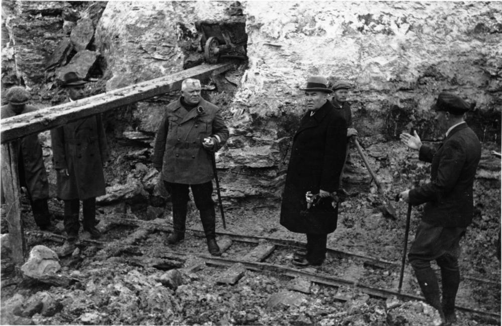 Latvijas Valsts amatpersonas Nāves salas ģipšakmens lauztuvju apmeklējuma laikā. No kreisās: 3. Latvijas Ministru prezidents Kārlis Ulmanis, 4. Valsts prezidents Alberts Kviesis.