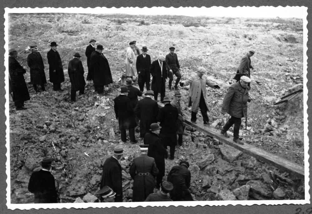 Latvijas Valsts amatpersonas Nāves salas ģipšakmens lauztuvju apmeklējuma laikā. No labās: 1. Latvijas Ministru prezidents Kārlis Ulmanis.
