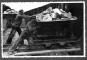 Strādnieki stumj vagoneti ar ģipša iežiem vilcienā Nāves salas ģipšakmens lauztuvēs.