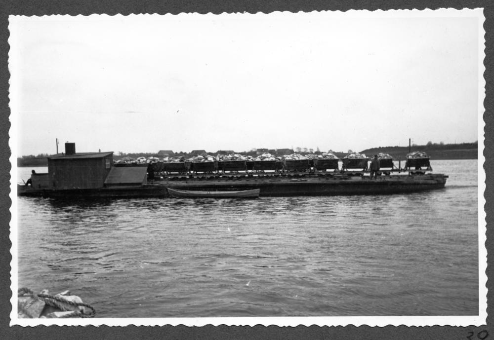 Prāmis Daugavā ved vagonetes ar ģipša iežiem no Nāves salas ģipšakmens lauztuvēm.
