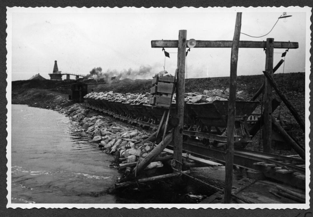 Vagonetes ar ģipša iežiem Nāves salas ģipšakmens lauztuvēs Daugavas krastā.