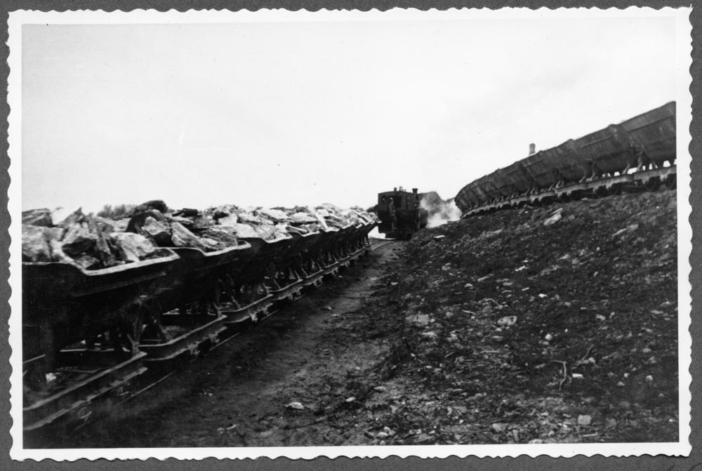 Vagonetes ar ģipša iežiem Nāves salas ģipšakmens lauztuvēs Daugavas krastā.
