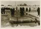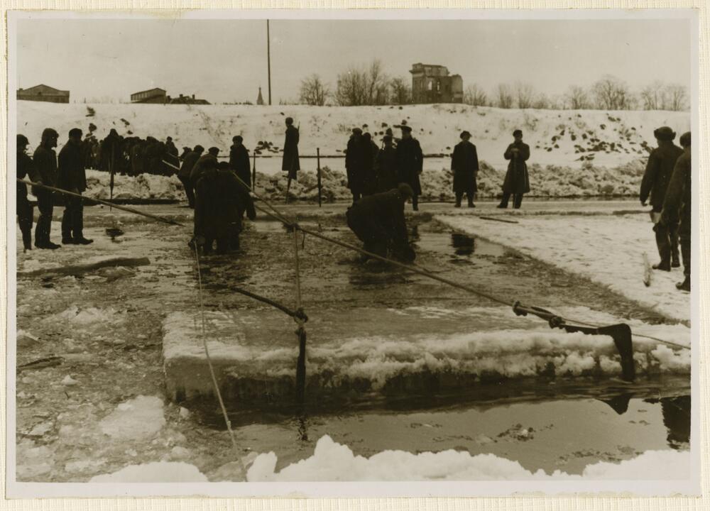 Strādnieki ar koka sviru un auklu palīdzību sadala lielākos ledus gabalus lai atbrīvotu ceļu Rīgas pontonu tilta fragmentu pārvietošanai.