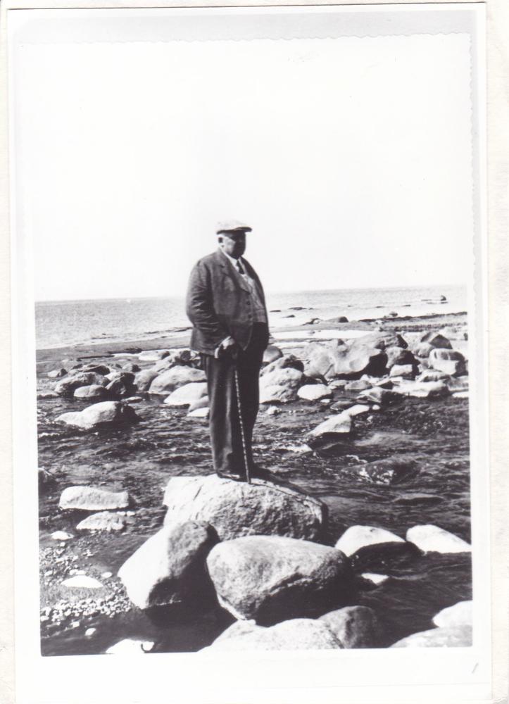 Latvijas Valsts un Ministru prezidents Kārlis Ulmanis brauciena pa Vidzemi laikā Tūjas jūrmalā stāv uz akmens ar spieķi rokā.