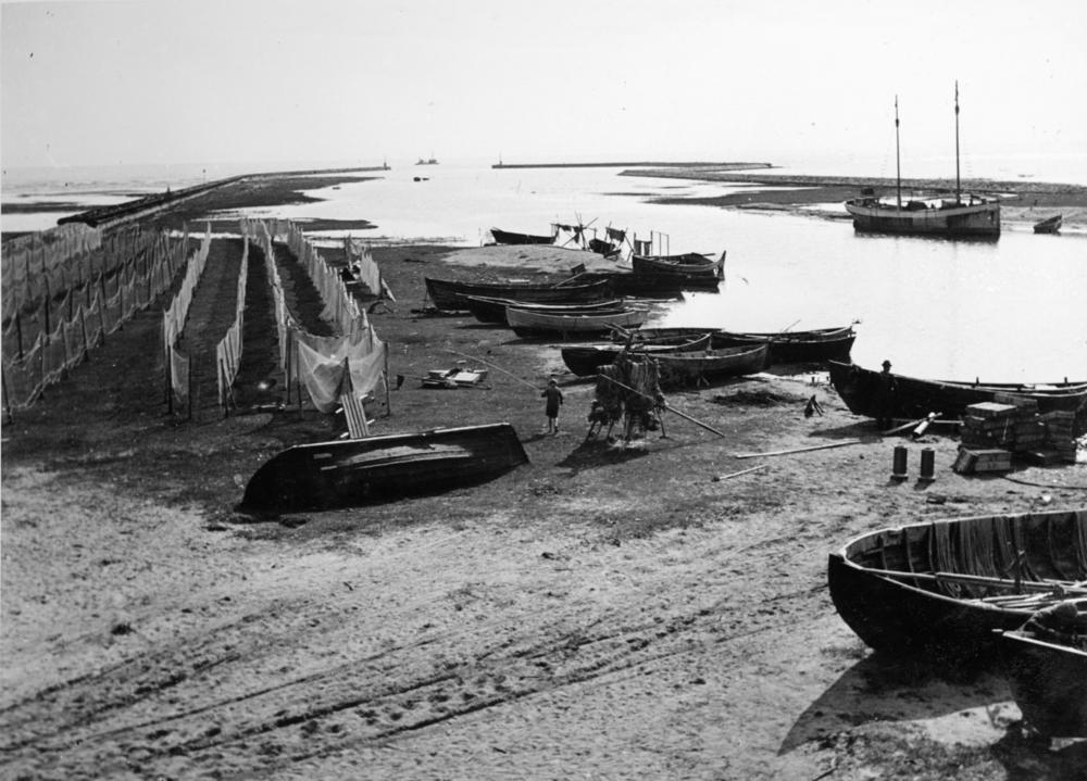 Skats uz Mērsraga zvejnieku ostu Mērsraga pagastā. Zvejas laivas un tīkli jūras krastmalā.