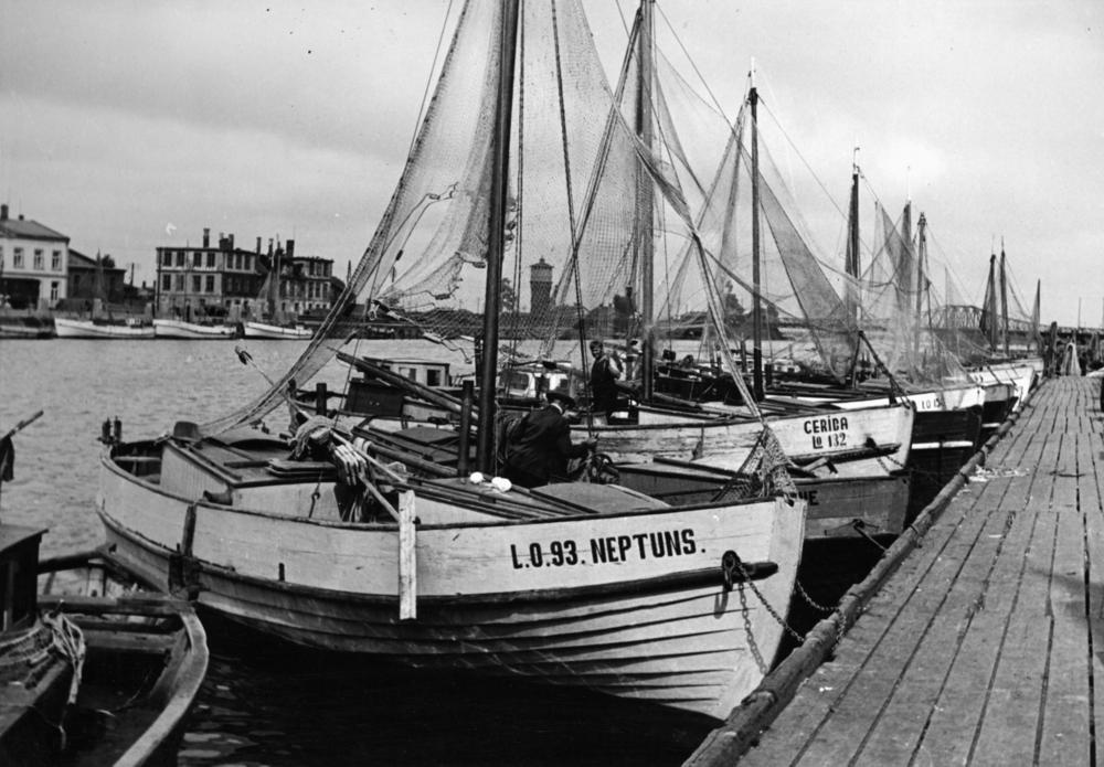 Liepājas zvejnieku ostas piestātne ar motorlaivām: "Neptuns", "Cerība" un citas. Fonā Liepājas dzelzceļa tilts (1879) pār Liepājas ezera kanālu, kas savieno ezeru ar jūru.