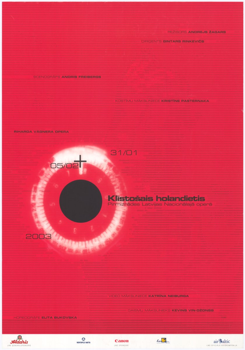 Riharda Vāgnera opera Klīstošais holandietis. Pirmizrādes Latvijas Nacionālajā operā 31/01 + 05/02 2003. [attēls]. Režisors Andrejs Žagars, diriģents Gintars Rinkēvičs, scenogrāfs Andris Freibergs, kostīmu māksliniece Kristīne Pasternaka, video māksliniece Katrīna Neiburgs, horeogrāfe Elita Bukovska, gaismu mākslinieks Kevins Vin-Džonss